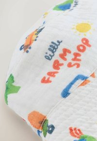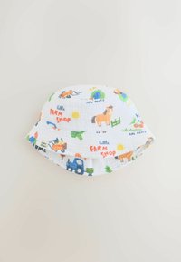 Deux chapeaux bob, l'un bleu uni et l'autre blanc avec des illustrations colorées sur le thème de la ferme, incluant des animaux, des tracteurs et du texte.