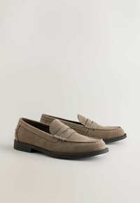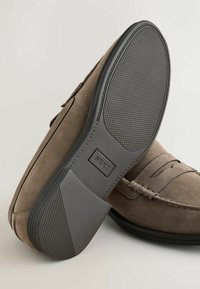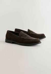 Mocassins en daim marron avec une finition lisse, un bout arrondi et des détails cousus ; dotés d'une semelle en caoutchouc noire et d'accents latéraux subtils.