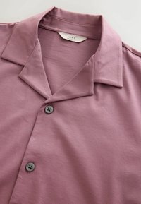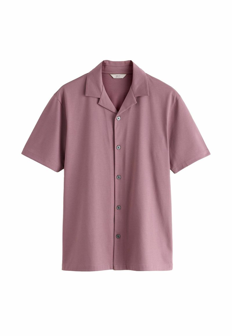 Chemise à manches courtes mauve avec col camp, cinq boutons sur le devant, présentée sur fond blanc.