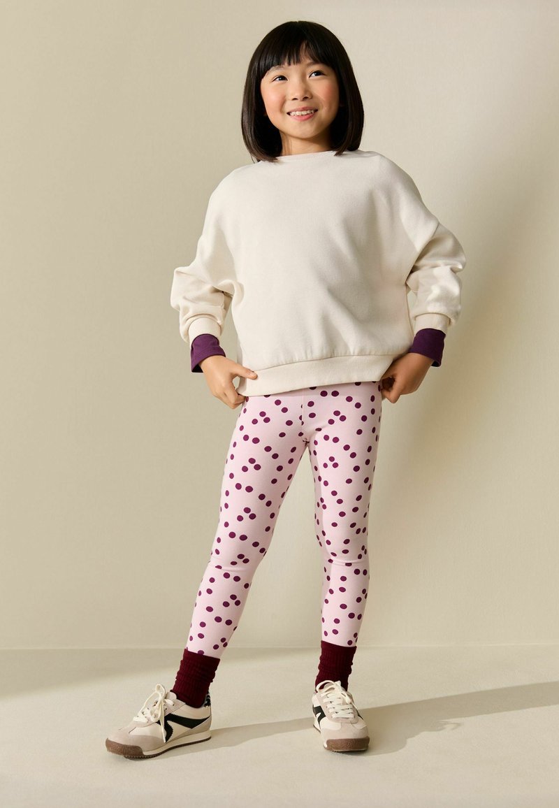 Sweat-shirt blanc avec des poignets violets, associé à des leggings rose clair ornés de pois bordeaux. Les chaussures sont beiges avec des accents noirs et des lacets blancs.
