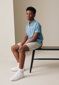 Personne portant un short beige, des chaussettes blanches et des baskets blanches, debout à l'intérieur avec une main dans la poche du short.