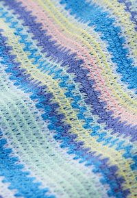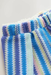 Pantalon à jambes larges avec rayures verticales en bleu, violet, vert clair et blanc, avec une taille élastique.