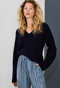 Pull en maille côtelée bleu marine avec col en V et manches longues, associé à un pantalon large à rayures bleues et blanches ; des chaussures décontractées complètent la tenue.