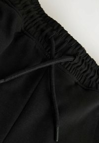 Pantalon de survêtement noir avec taille élastique, cordon de serrage, panneaux latéraux verts et bandes blanches le long des coutures extérieures. Poignets côtelés aux chevilles.