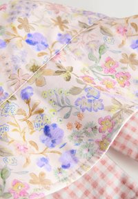 Chapeau bob réversible avec un motif floral pastel d'un côté et un tissu vichy rose de l'autre, tissu doux avec un large bord.