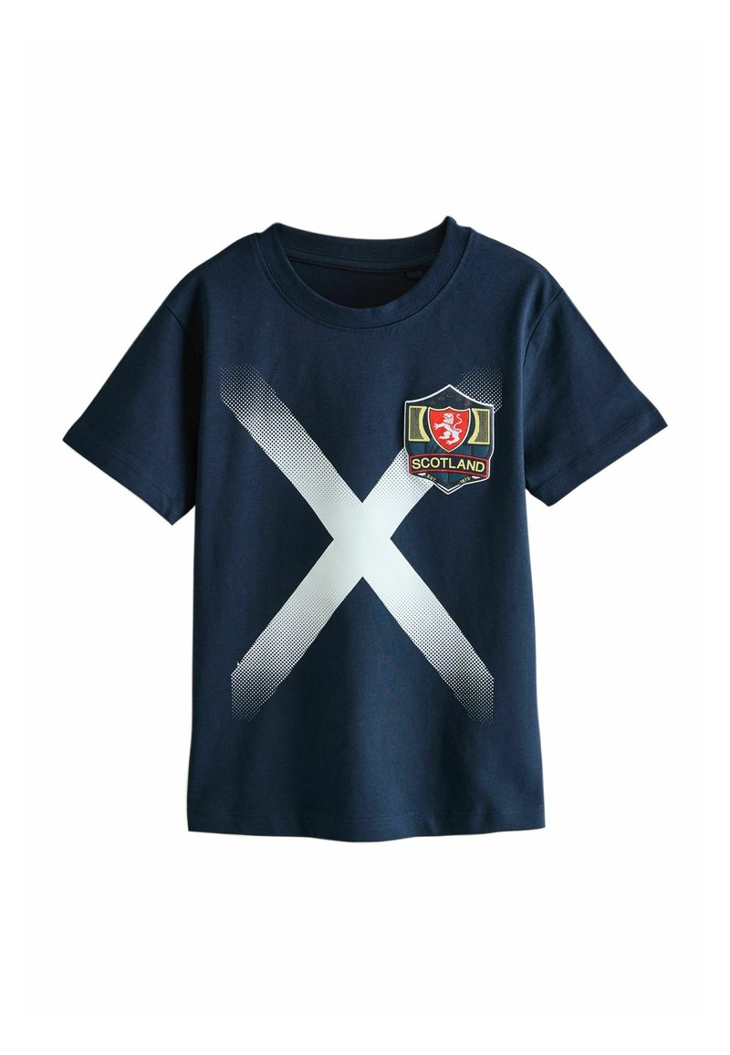 T-shirt bleu marine avec une grande croix blanche de saint André et un écusson du blason d'Écosse sur la poitrine gauche.