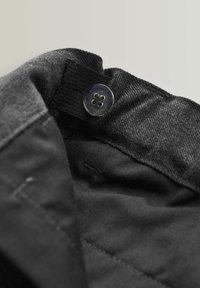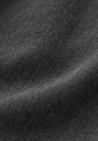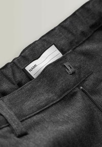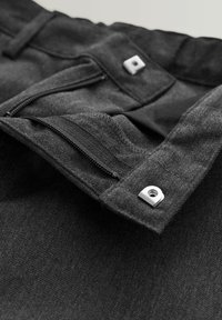 Pantalon gris foncé, ajusté, avec une texture lisse, doté de poches avant et de passants pour ceinture. Coupe droite avec une finition nette.