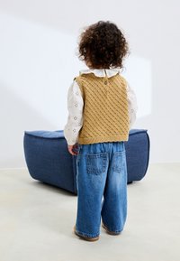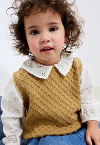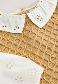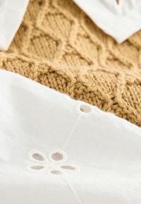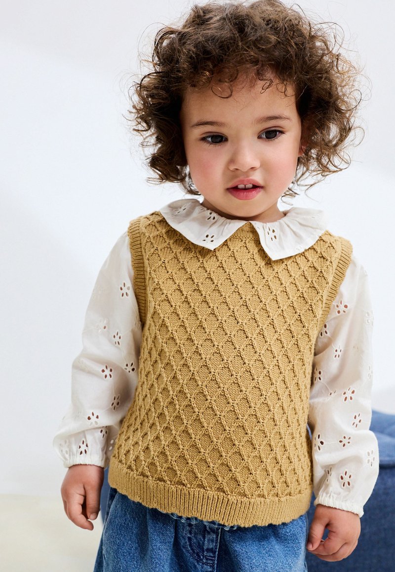 Veste en maille jaune moutarde avec un motif en losange, portée sur un chemisier blanc avec des détails en broderie ajourée et un col Claudine.