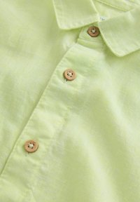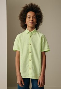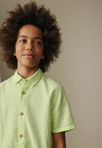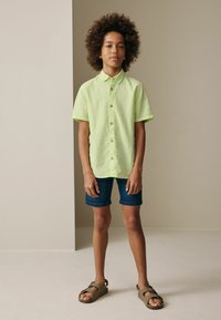 Enfant aux cheveux bouclés portant une chemise à manches courtes vert clair à boutons, un short en denim foncé et des sandales marron, debout à l'intérieur.
