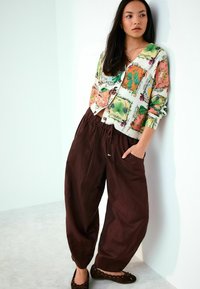 Femme aux cheveux longs et foncés portant un cardigan blanc boutonné avec des imprimés colorés de feuilles et de fruits, et un pantalon marron foncé, posant avec une main dans la poche.