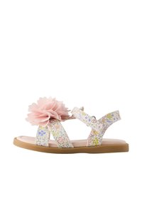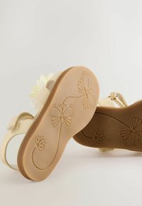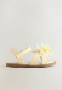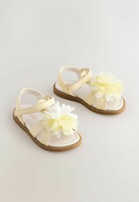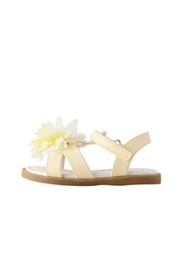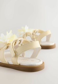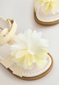Sandale beige pour enfants avec bride réglable et grande fleur décorative en tissu jaune pâle sur le dessus, semelle plate marron.