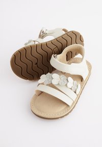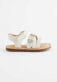 Sandales blanches à trois brides, ornées d'un accent en forme de cœur pailleté. Semelle intérieure douce et semelle extérieure en caoutchouc pour un confort optimal.