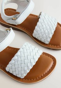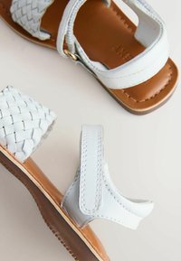 Sandale blanche tissée à enfiler avec une semelle intérieure rembourrée, une bride réglable et une semelle marron. Caractéristiques : partie supérieure texturée et accents en cuir lisse.
