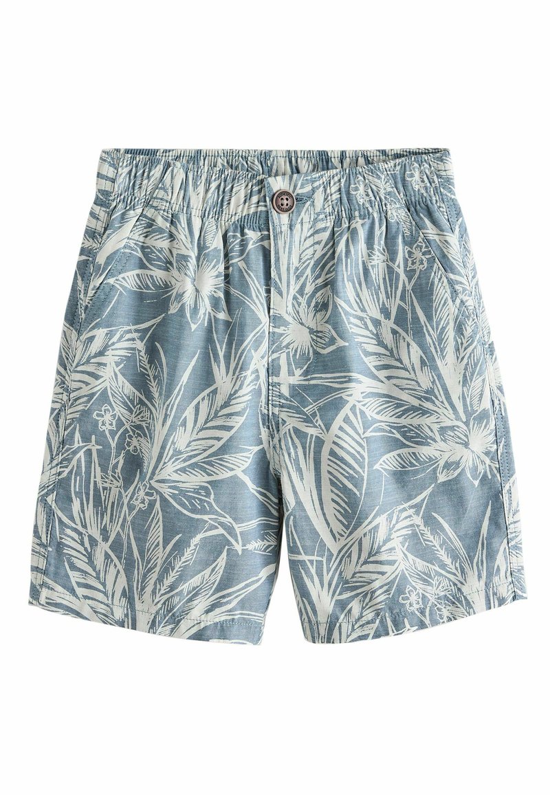 Shorts décontractés bleus avec imprimé blanc de feuilles et fleurs tropicales, taille élastique, bouton à l'avant et poches latérales.