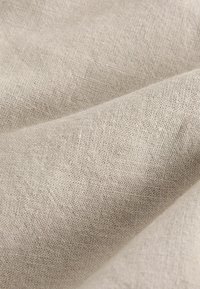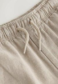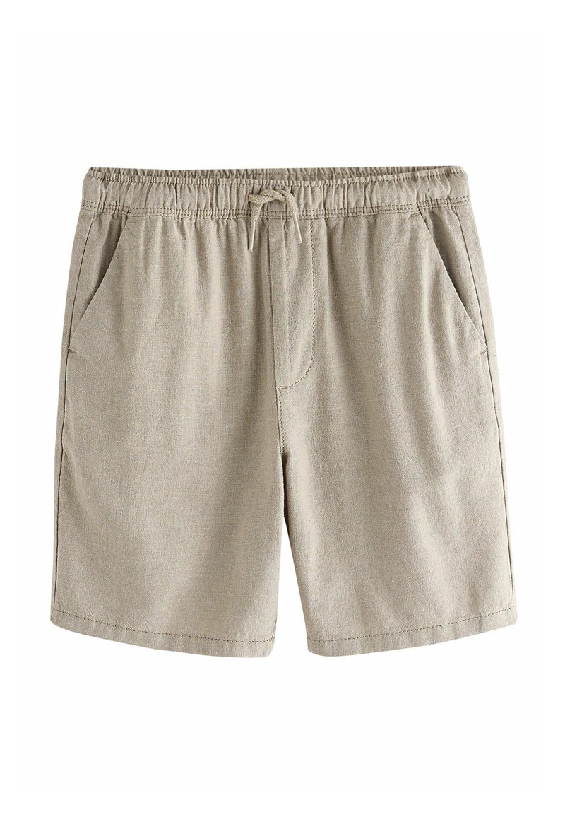 Shorts beiges décontractés avec taille élastique, cordon de serrage, poches latérales et ourlet droit, fabriqués en tissu léger.