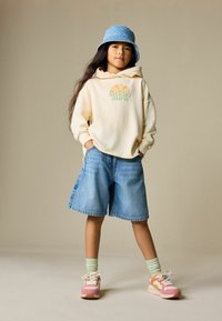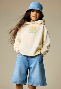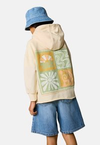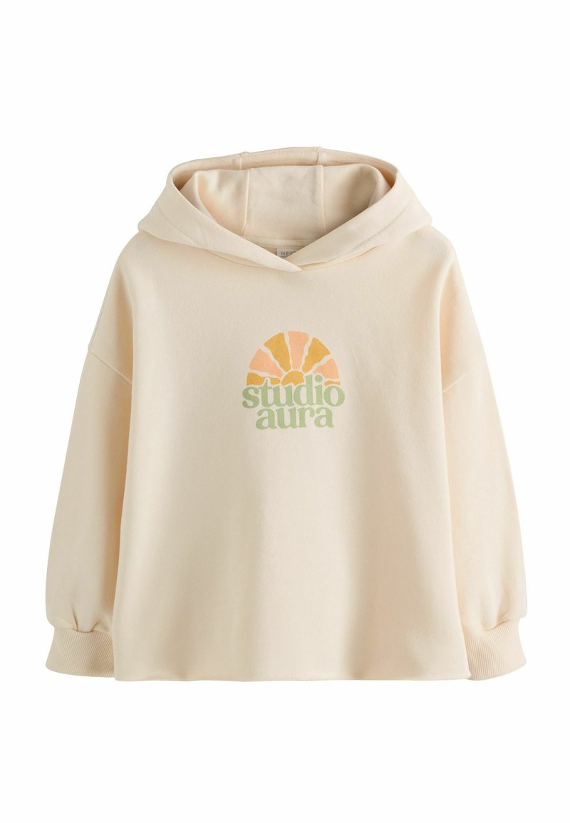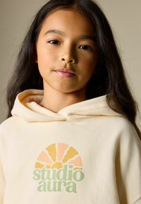 Sweat à capuche beige clair en tissu doux, avec capuche et poignets élastiques. Affiche un graphisme avec un soleil stylisé et le texte "studio aura".