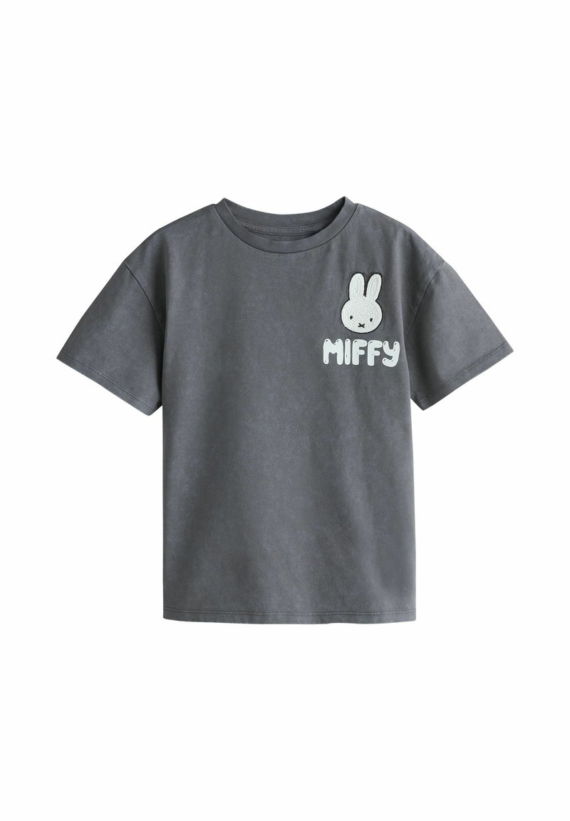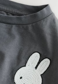 T-shirt gris foncé à manches courtes avec une petite tête de lapin dessin animé blanche et le texte "MIFFY" sur la partie supérieure gauche de la poitrine.