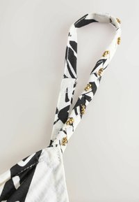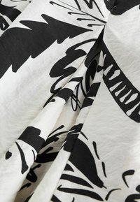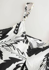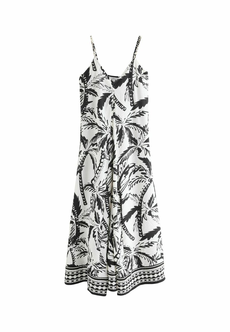 Robe à imprimé feuilles de palmier noir et blanc avec fines bretelles, design fluide et ourlet à motifs. Tissu léger avec une coupe décontractée.