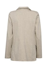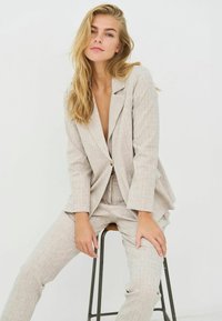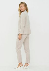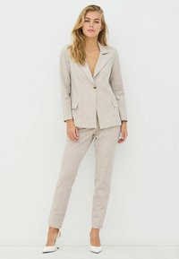 Blazer beige sur mesure avec un col cranté et un bouton unique en or, assorti à un pantalon assorti slim et des escarpins blancs à bout pointu.