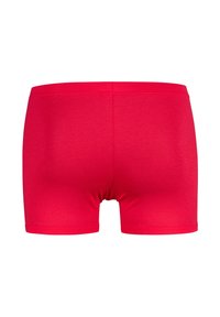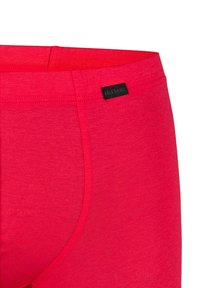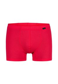 Boxers rouges pour hommes, design ajusté, ceinture plate, avec une petite étiquette de marque noire sur le côté droit.