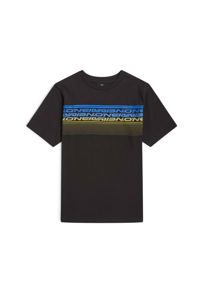 T-shirt en coton noir avec un motif horizontal à rayures bleues et jaunes et texte répété. Manches courtes et col rond.
