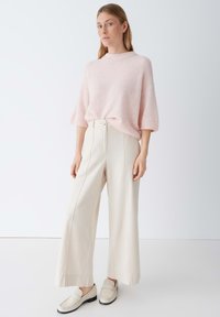 Femme portant un pantalon large à taille haute couleur crème, associé à des mocassins crème assortis et un pull rose pâle.