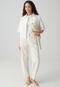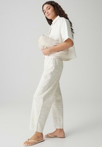 Femme portant un pantalon crème taille haute, coupe ample avec de discrètes rayures zébrées, un haut blanc rentré et des sandales beige, debout sur un fond clair.