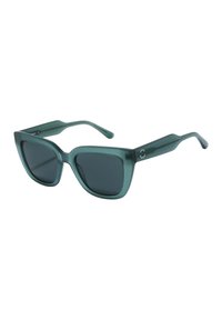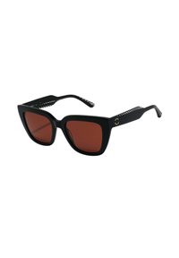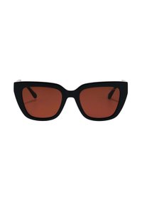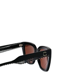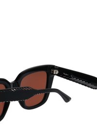 Lunettes de soleil carrées surdimensionnées noires avec verres bruns et détails perforés subtils sur les branches, vue inclinée sur fond blanc.