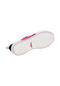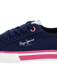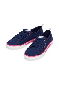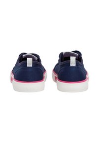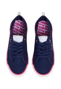 Baskets en toile bleu marine avec une semelle blanche ornée d'accents roses, des lacets ronds et un détail logo sur le côté. Texture lisse avec une coupe basse.