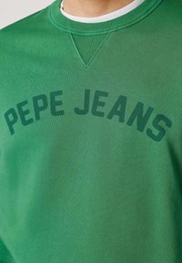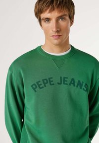 Sweat-shirt vert à col ras du cou en coton, avec encolure et poignets côtelés. "PEPE JEANS" imprimé en grosses lettres sur le devant. Coupe décontractée.