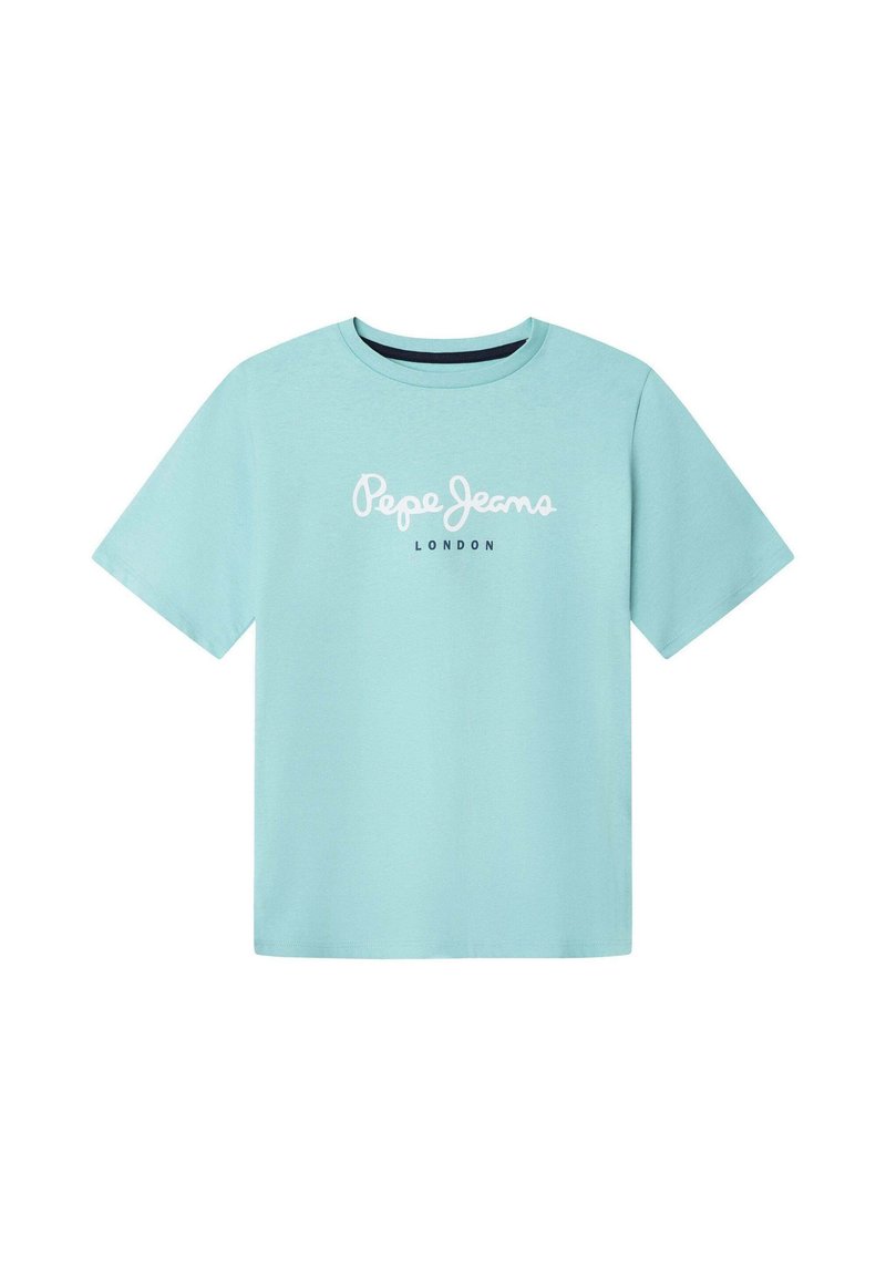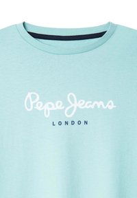 T-shirt bleu clair à manches courtes en coton, avec le texte "Pepe Jeans LONDON" en blanc et noir. Col rond, coupe décontractée.