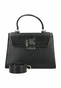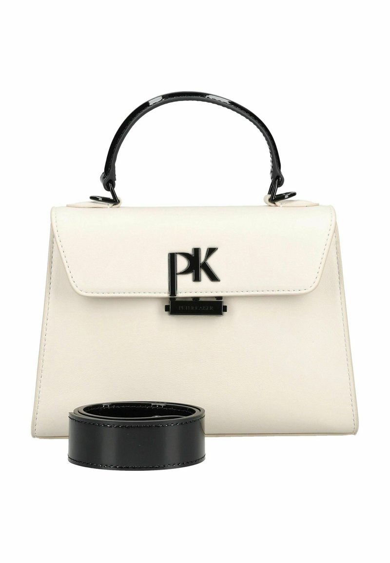 Sac à main crème avec poignée supérieure noire et bandoulière noire amovible, doté d'un fermoir logo "PK" noir sur le rabat avant.