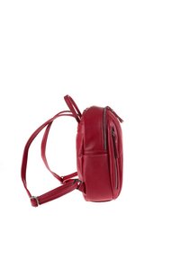 Sac à dos en cuir rouge avec une forme arrondie, deux compartiments zippés, des bretelles réglables et un détail de logo à l'avant.