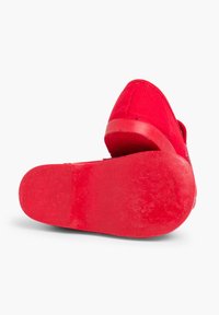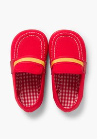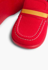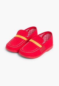 Chaussure slip-on en toile rouge avec une semelle en caoutchouc plate, un dessus replié, et une bande jaune au milieu. Doublée d'un motif à carreaux.