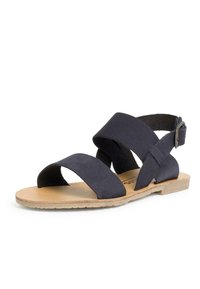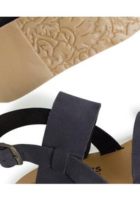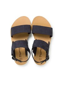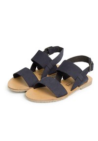 Sandales en suede bleu marine avec deux larges brides et une sangle de cheville à boucle sur une semelle extérieure beige clair. Design ouvert sur le devant et semelle plate pour le confort.