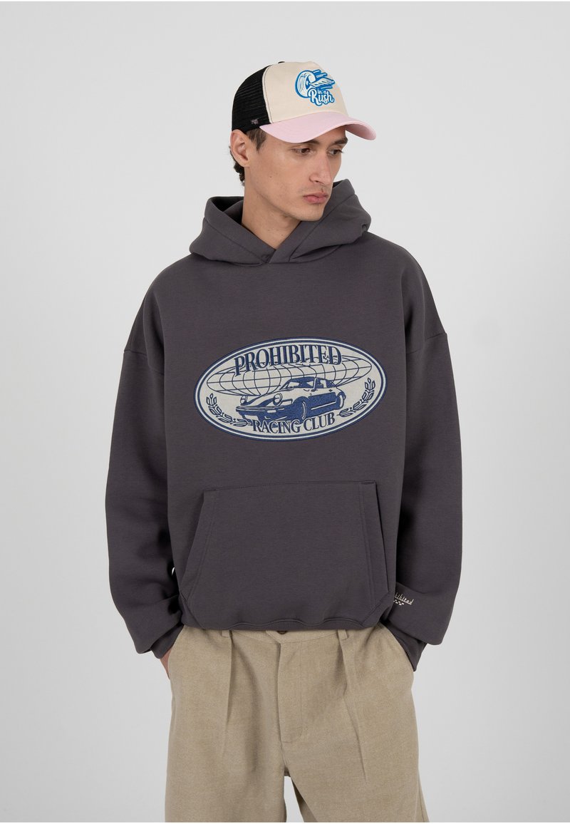 Jeune homme portant un sweat à capuche gris foncé avec le logo "Prohibited Racing Club" et un pantalon beige, regardant vers sa droite, portant une casquette beige et rose.