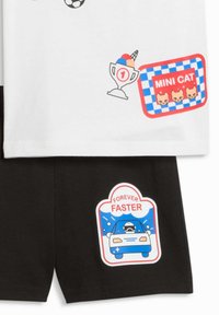 T-shirt en coton blanc avec des patchs graphiques colorés, incluant des thèmes de conduite et de sport, associé à un short noir présentant des motifs similaires.