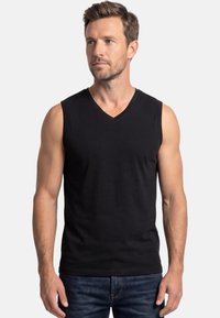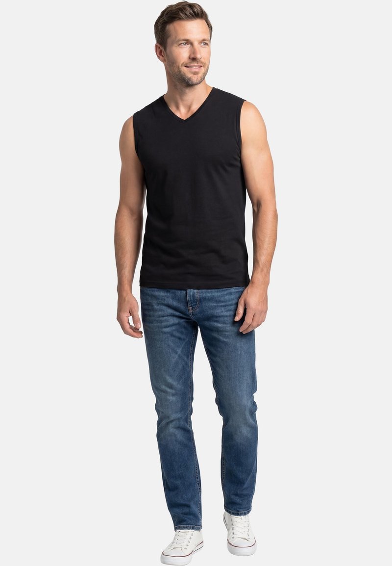 Homme debout portant un débardeur noir à col en V, un jean bleu et des baskets blanches, regardant légèrement sur le côté et souriant.