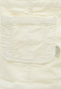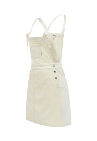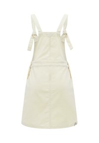 Robe salopette en denim couleur crème avec poche avant, bretelles réglables nouées aux épaules et côtés boutonnés.