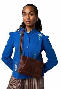 Veste bleue boutonnée avec broderie florale et sac bandoulière en cuir marron. Pantalon rayé avec un design simple et légèrement brillant.