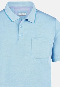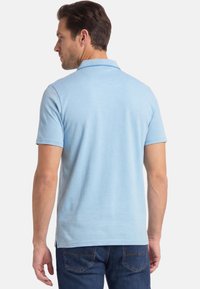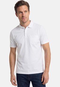 Homme portant un polo blanc à manches courtes, un jean bleu foncé et des baskets marron, debout sur un fond blanc uni.