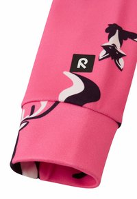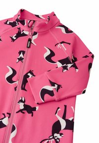 Survêtement rose à fermeture éclair intégrale avec des motifs de renard noir et blanc, en tissu doux, à manches longues et avec des poignets élastiques. Enfant dans une pose ludique.