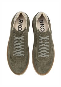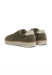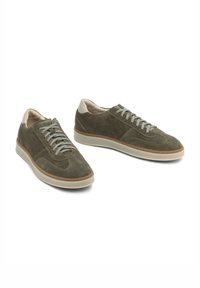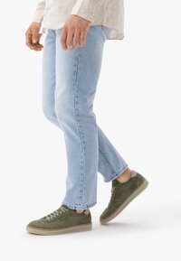 Personne portant un jean bleu clair et des baskets en daim vert olive, debout avec un pied légèrement levé sur un fond blanc.
