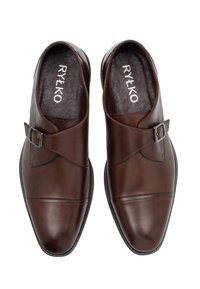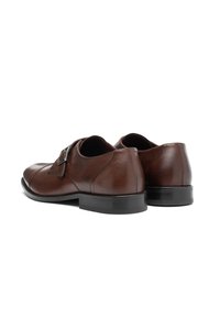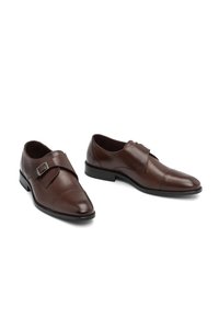 Chaussure habillée en cuir marron au design élégant, avec une boucle décorative et un bout arrondi. Semelle plate avec une traction minimale.