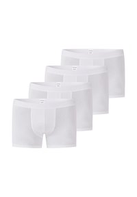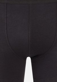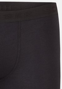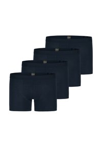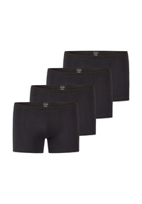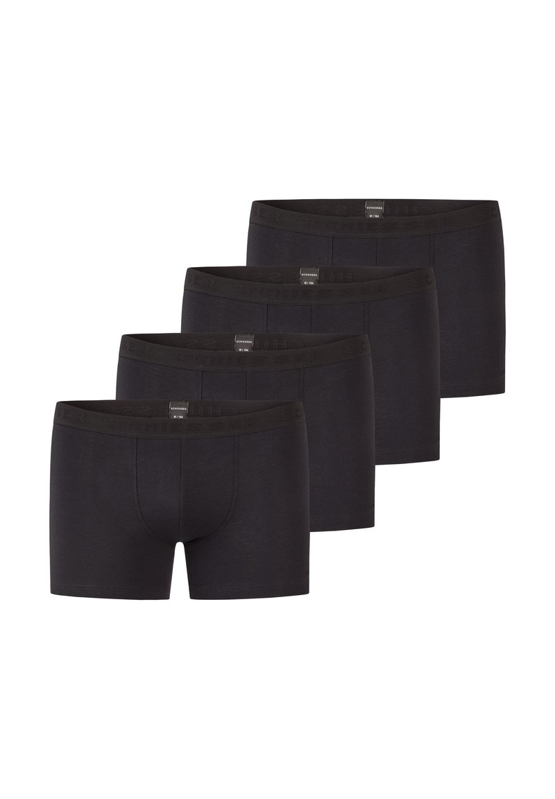 Quatre boxers noirs disposés en rangée décalée, chacun avec une étiquette visible à la taille, sur un fond blanc uni.