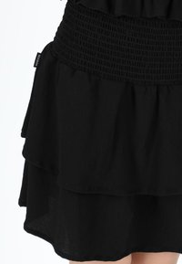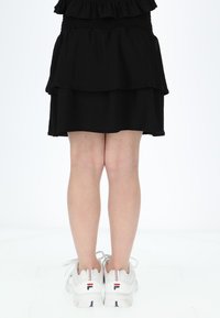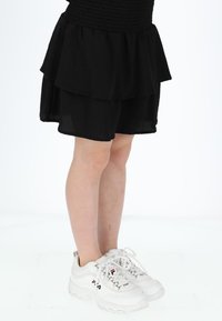 Robe noire à couches avec un corsage smocké et des accents en volants. Associée à des chaussures de sport blanches avec des détails gris et rouges.