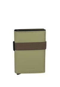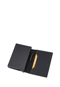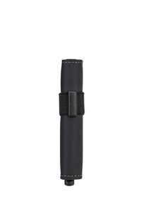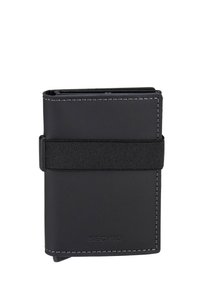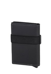 Portefeuille en cuir noir avec coutures grises et une large bande élastique autour du milieu, embossée du mot "SECRID" sur le devant.