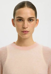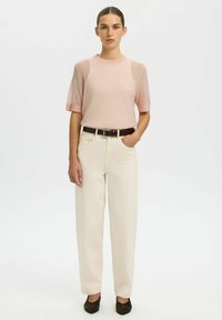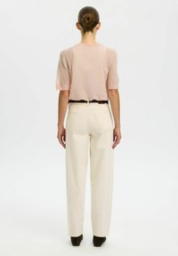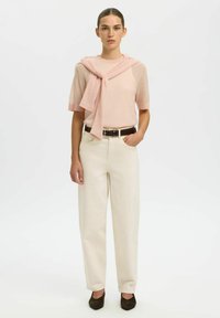 Femme aux cheveux foncés attachés porte un pull rose clair à manches courtes et un pantalon crème taille haute avec une ceinture foncée, une main dans la poche.