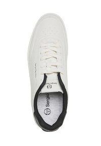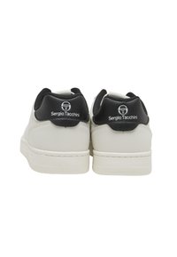 Baskets basses blanches avec col noir, fermeture à lacets à l'avant, et marquage Sergio Tacchini sur le côté et le talon.