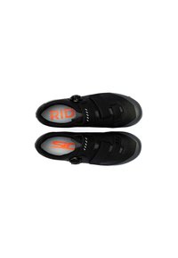 Chaussure de cyclisme noire au design élégant, avec une tige texturée, deux sangles ajustables et une semelle robuste avec des accents rouges.